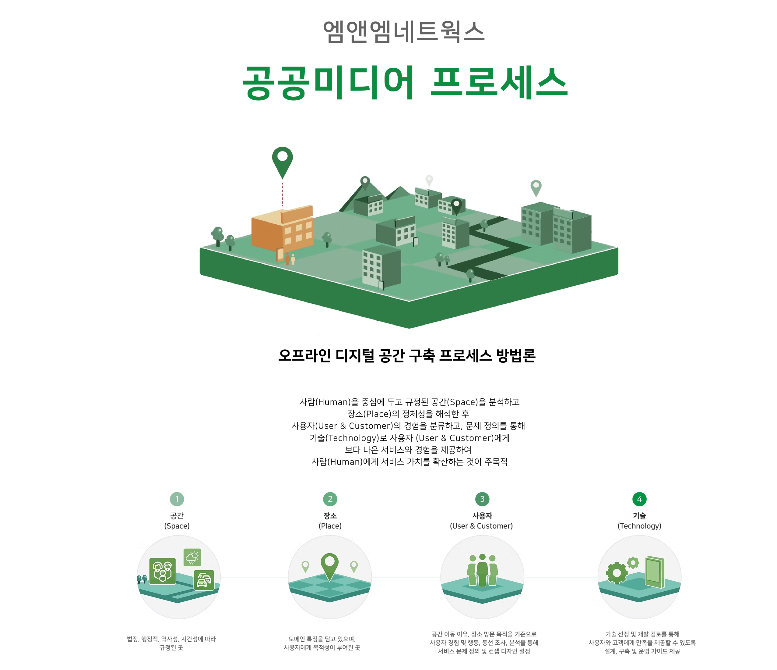 기업과 정부 기관 및 지자체가 디지털 사이니지 & 공공 미디어 도입에 어려움을 겪는 것을 알고 있었기에 문제를 해결하고, 사업과 서비스 모델을 만들어 주는 역할로 활동하였다. 초기에는 이전 회사에서 구축한 네트워크를 바탕으로 마케팅을 해 나갔다.